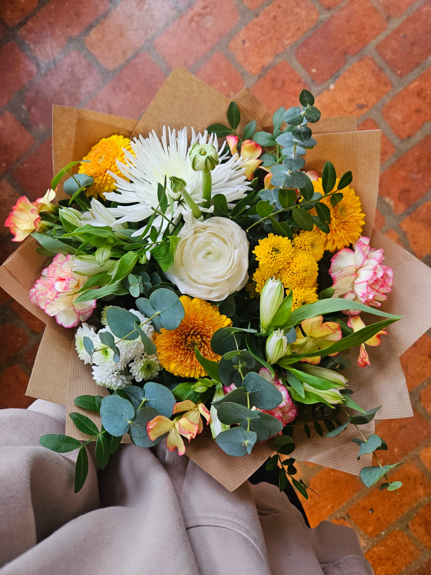Složení kytice: santina, chryzantéma, karafiát, alstromérie, ranunculus, eukalyptu